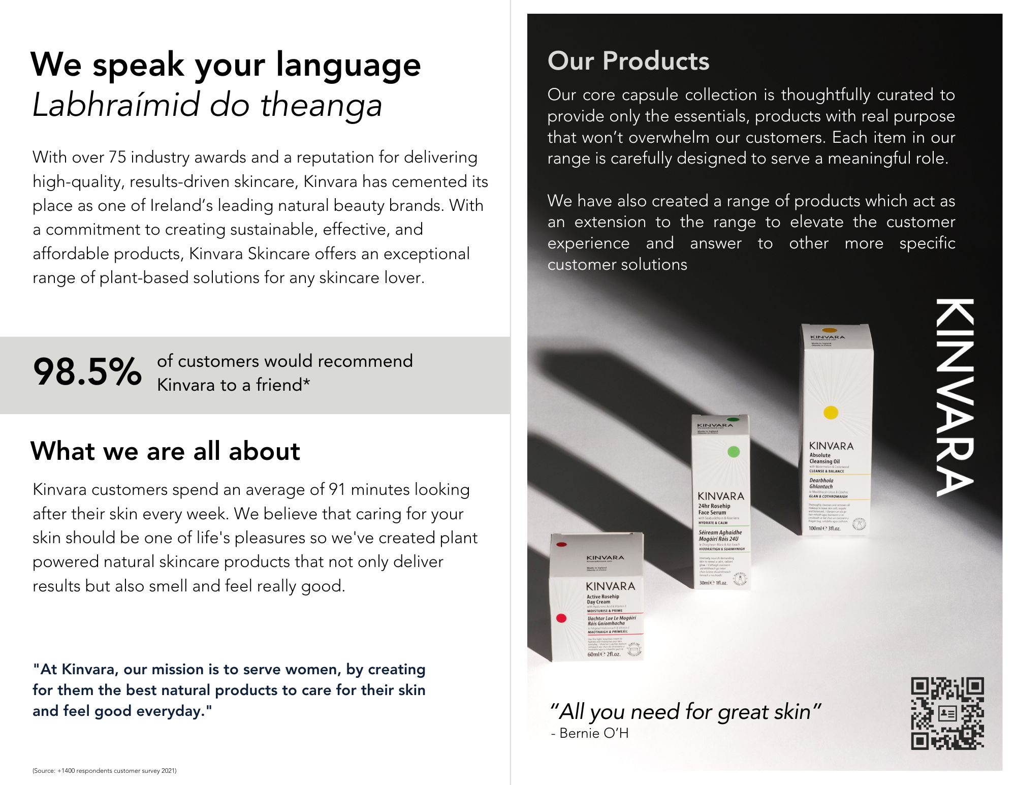 Now with over 75 industry awards and a reputation for delivering high-quality, results-driven skincare, Kinvara has cemented its place as one of Ireland’s leading natural beauty brands. With a commitment to creating sustainable, effective, and affordable products, Kinvara Skincare offers an exceptional range of plant-based solutions for any skincare lover.
